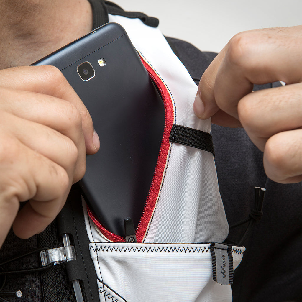 The expandable hydration vest SIMER 7 L It has all the pockets and compartments of the SIMER II 10 L : 1 main compartment with division for a hydration bag plus 11 pockets, all within easy reach.