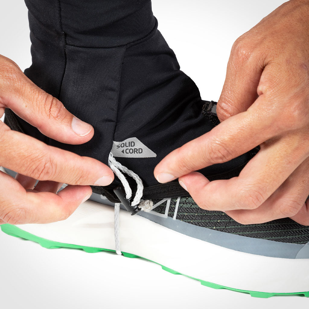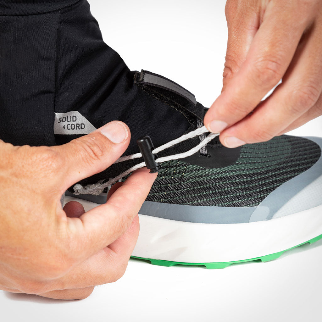 2. Ajusta el cordón: Una vez que tengas la zapatilla puesta, pasa el cordón de la polaina por debajo de la suela. Ajusta el cordón utilizando la tanca y guarda el sobrante en el bolsillo.
