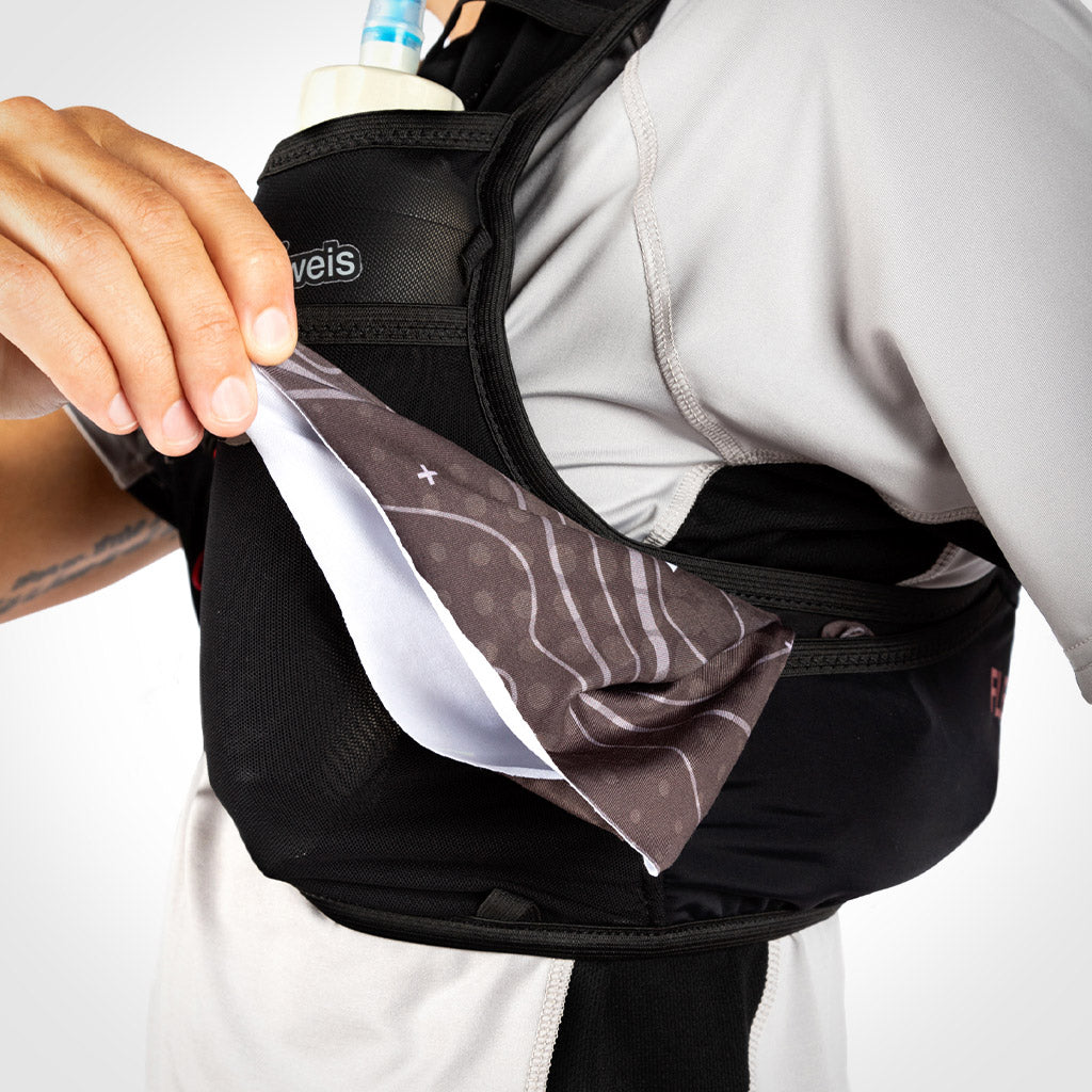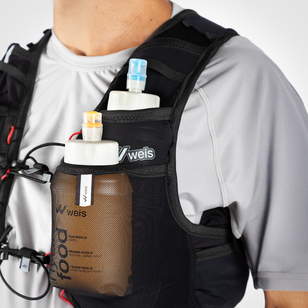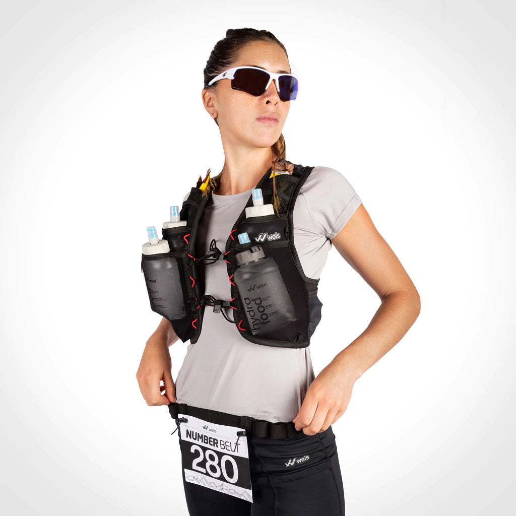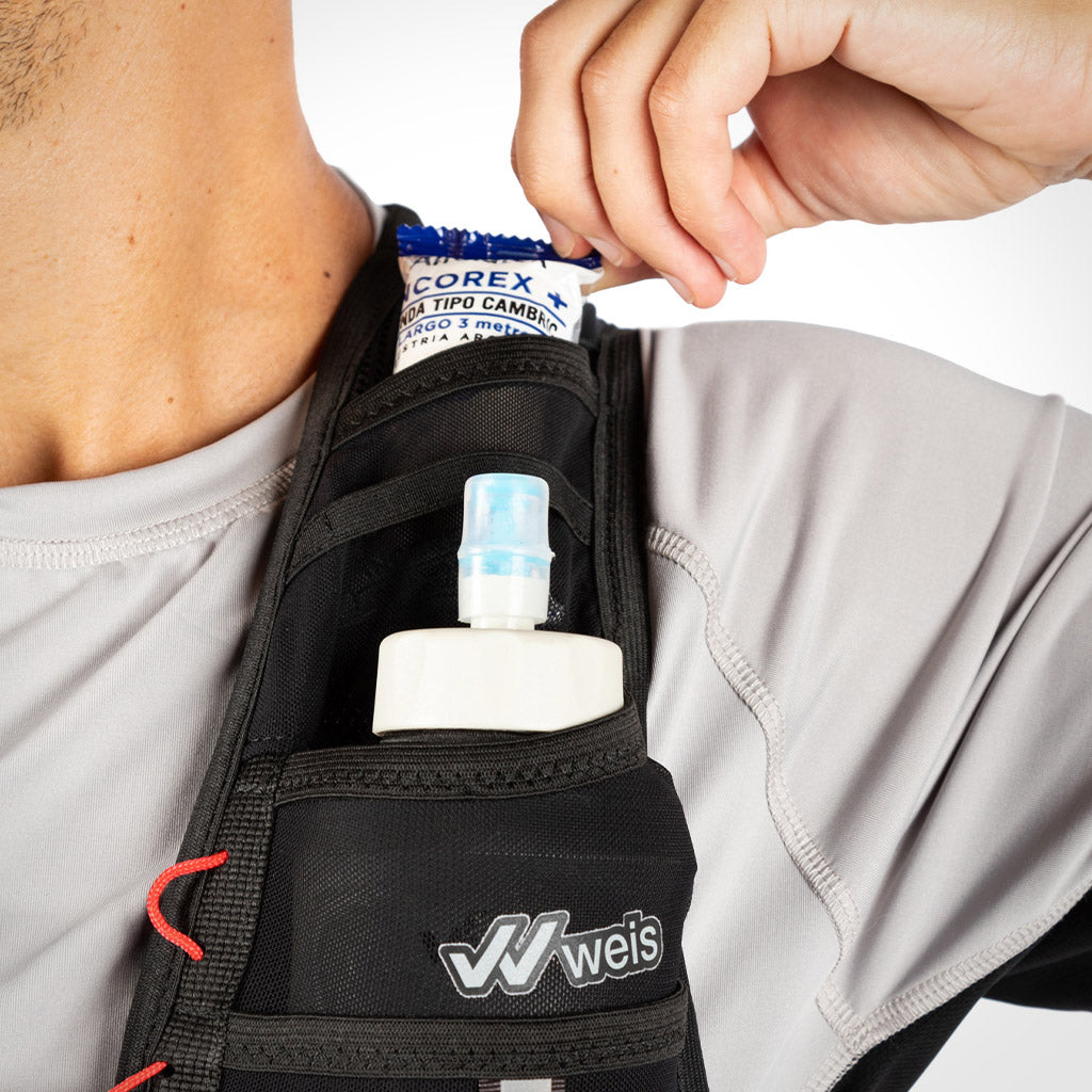 - 2 compartimentos frontales extra que pueden utilizarse para guardar soft flasks de 350 ml llenos, para complementar la hidratación en carrera.