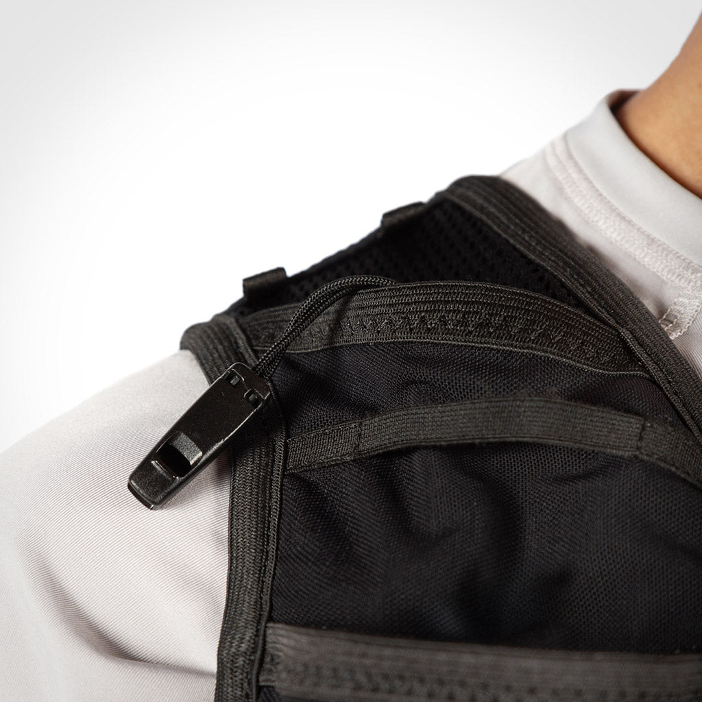 - Silbato de emergencia (incluido) con cordón y goma de sujeción elástica para evitar balanceos.