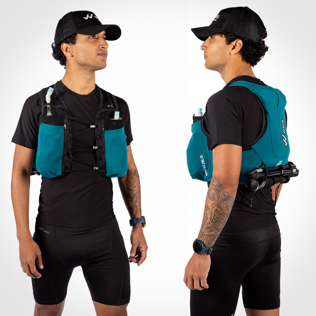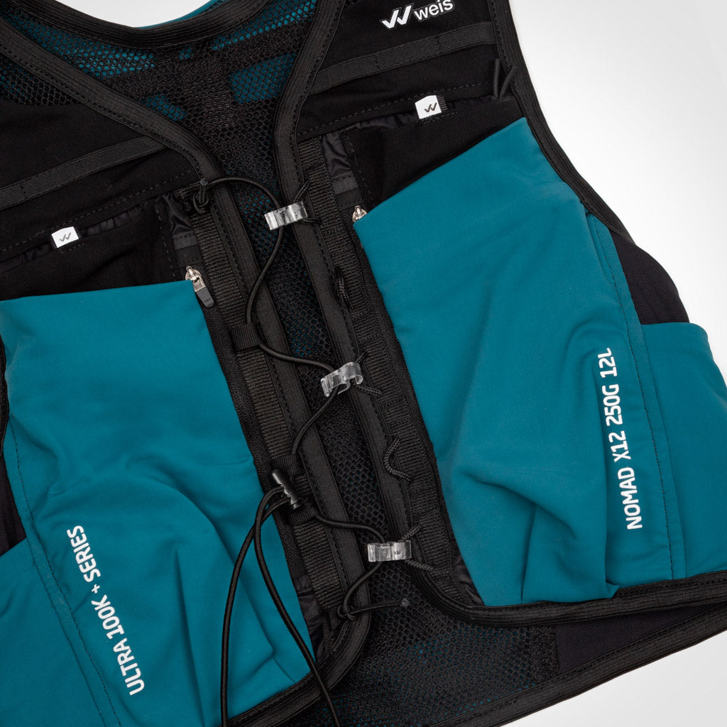 Dispone de 12 bolsillos multifuncionales para móvil, geles, barritas energéticas, comida, bebida, gafas de sol, frontal, manta térmica, ropa, basura y todo lo necesario para ultras o entrenamientos largos.