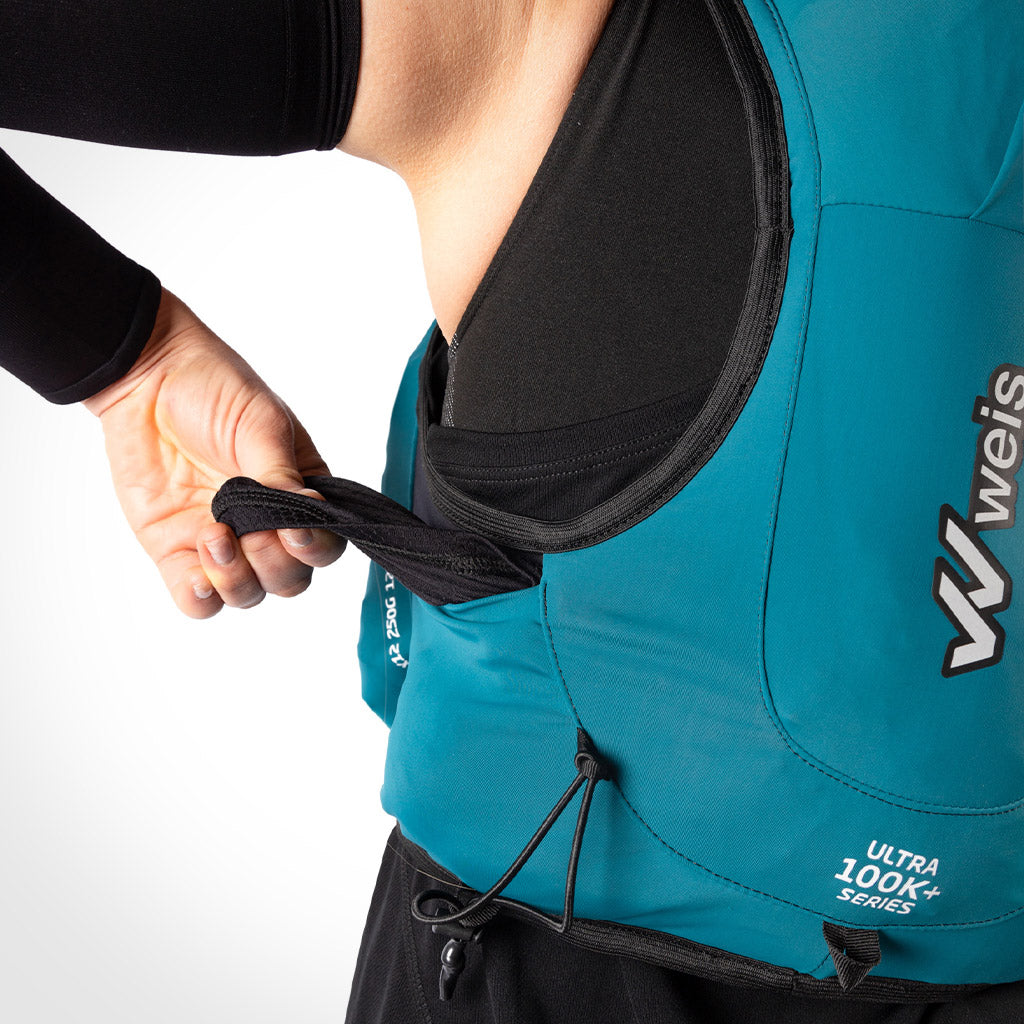 El Departamento de I+D de Weis creó las COMFORT PADS™ para reducir la presión y evitar las rozaduras cuando el chaleco va muy cargado. Son almohadillas desmontables, fáciles de colocar y retirar mediante aberturas en la parte trasera del chaleco, a la altura de los bolsillos. Imprescindibles para quienes corren ultras.