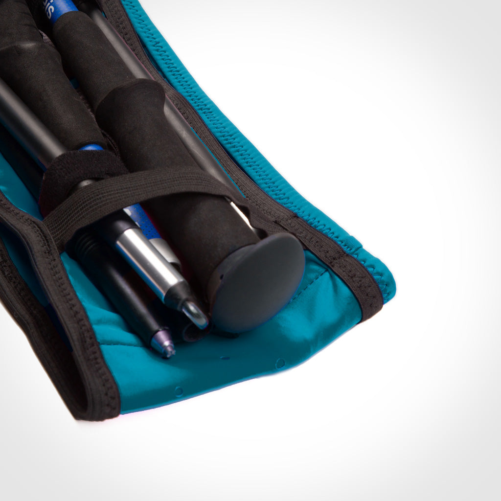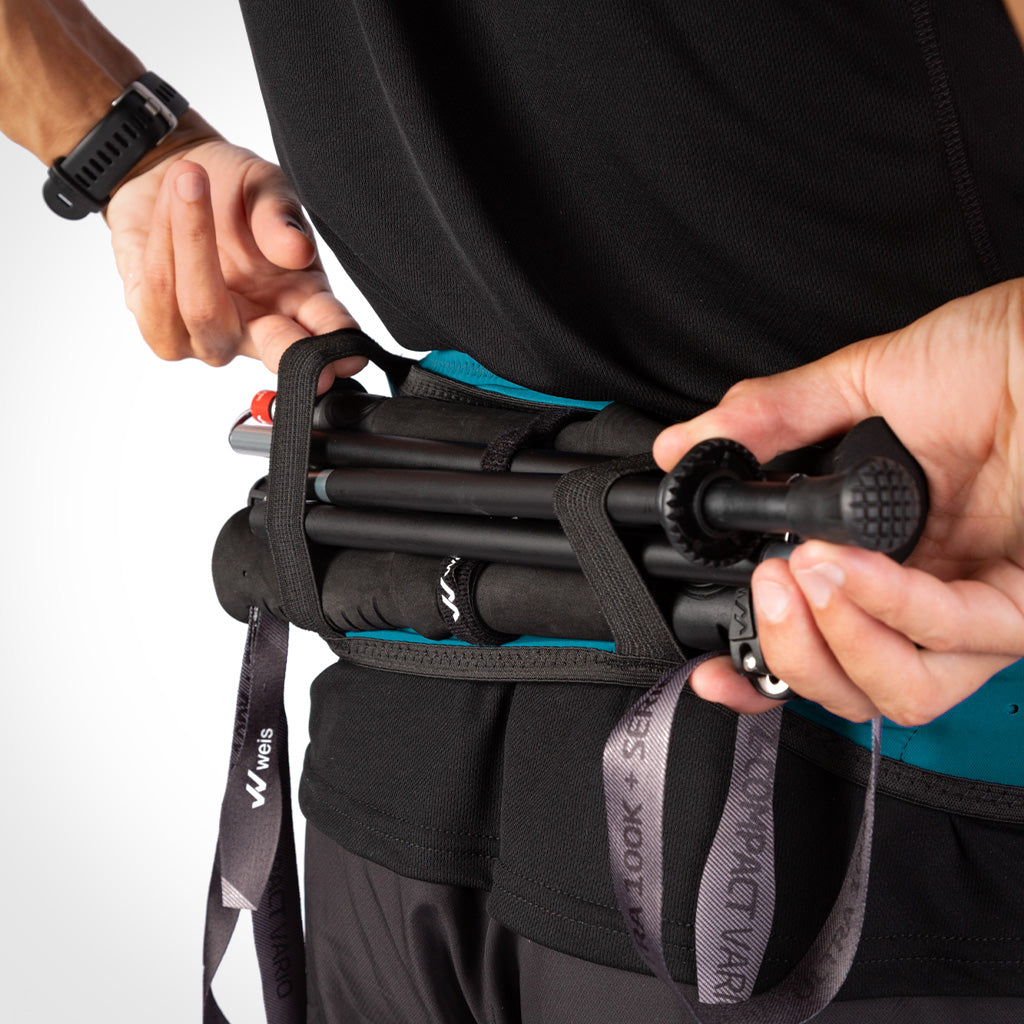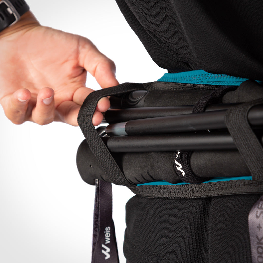 La SIMER BELT es un cinturón portabastones de ajuste ceñido pero flexible, que se adapta al cuerpo sin provocar rebotes durante la carrera. Ultraligera y funcional, permite un acceso rápido y sencillo a todo lo esencial gracias a sus múltiples opciones de almacenamiento: un bolsillo con cremallera, cuatro compartimentos expandibles (delantero, trasero y laterales) y dos elásticos específicos para llevar los bastones plegados a la cintura, ideales para los momentos en los que necesitas liberar los brazos y descansar.